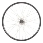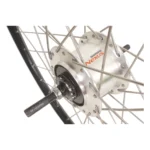 Wiel uitgevoerd met Shimano Nexus 7 versnellingsnaaf met rollerbrakeaansluiting. Met zwarte velg en RVS spaken.