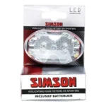 Simson Batterij Voorlicht met 5 witte led s en handige aan/uit knop. Klik het voorlicht eenvoudig vast aan een riem of monteer deze met behulp van een kruiskopschroevendraaier en de meegeleverde bevestigingsring op de zadelpen. Het fietslampje kan vervolgens eenvoudig in en uit de bevestigingsring worden geklikt. Inclusief 2 x AAA batterijen.