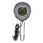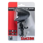 De Simson Naafdynamo LED koplamp “Round” is een klassieke koplamp in een kunststof uitvoering. De Koplamp met geïntegreerde reflector heeft een lichtopbrengst van 7 LUX en een makkelijk bedienbare aan/uit knop. De koplamp is geschikt voor voorvork montage en is eenvoudig te bevestigen op het kroonstuk van de voorvork. Sluit vervolgens de lamp met het meegeleverde verlichtingssnoer aan op de (naaf)dynamo. Ook het achterlicht kan op deze koplamp worden aangesloten op de aansluitpolen.